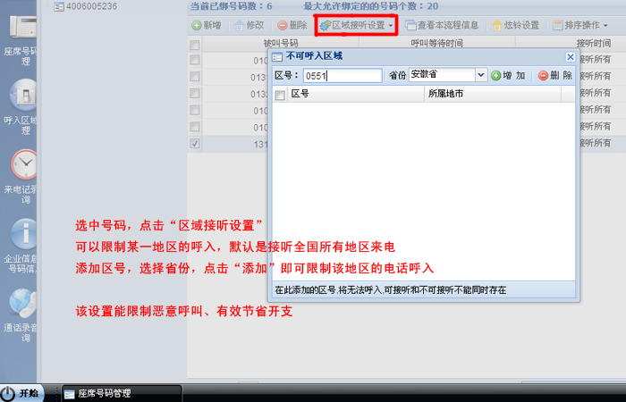 比如: 上海某家公司办理了400电话,但是不做天津地区的业务,想限制天津地区的来电,那么就可以通过后台的“接听区域“功能来设置,具体操作请参考下图: